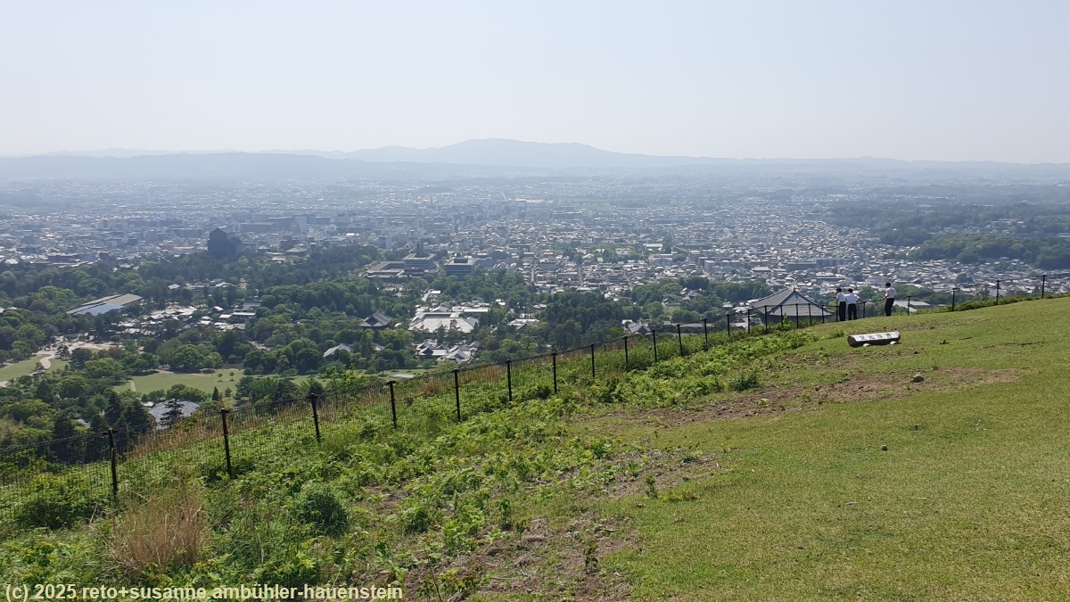 erst durch einen angenehm kühlen wald und dann über eine strasse ohne schatten geht es südwärts. wir erreichen den nara park. hier führt eine lange treppe auf einen hügel hinauf. wir wollen uns diesen kleinen umweg nicht entgehen lassen und erklimmen die steile treppe. diese folgt glücklicherweise dem waldrand und ist daher im schatten. auf kurzer distanz erklimmen wir 130 höhenmeter. vom aussichtspunkt knapp unter dem höchsten punkt haben wir eine fantastische rundsicht über die stadt. auch heute ist die fernsicht getrübt. wir sind uns nicht sicher, ob es wirklich so viel feuchtigkeit in der luft hat, oder ob das nicht eher smog ist. vom aussichtspunkt geht es wieder über eine lange treppe abwärts.