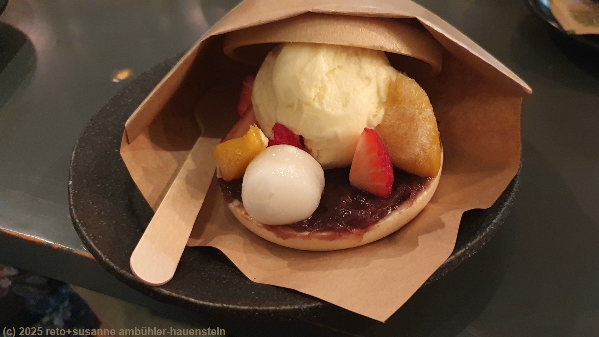 auf dem rückweg zum hotel gehen wir durch die gedeckte einkaufsstrasse konishi-sakura-dori. in dieser ist es erstaunlich kühl. wir fragen uns, ob die temperatur wirklich nur wegen dem dach so angenehm ist, oder ob aus den läden so viel kalte luft strömt, dass es selbst auf der strasse kühl ist. um 16:30 uhr sind wir beim hotel. dank meinem pre-checkin geht das registrieren sehr rasch. wieder dürfen wir in einem zimmer im obersten stock übernachten. wir richten uns ein und duschen. danach führe ich die bücher nach, susanne liest ein wenig. gegen 18:15 uhr machen wir uns auf die suche nach einem restaurant fürs nachtessen. einmal mehr tun wir uns recht schwer mit der wahl. erschwerend kommt dazu, dass in nara nur wenige lokale eine englische menukarte haben. schliesslich entscheiden wir uns für ein indisches restaurant und werden nicht enttäuscht. auf dem rückweg zum hotel spazieren wir durch die gedeckte mochiidono shopping street und geniessen in einem schönen cafe kaffee, tee und ein japanisches dessert mit dem namen "NARAD in der Mitte".