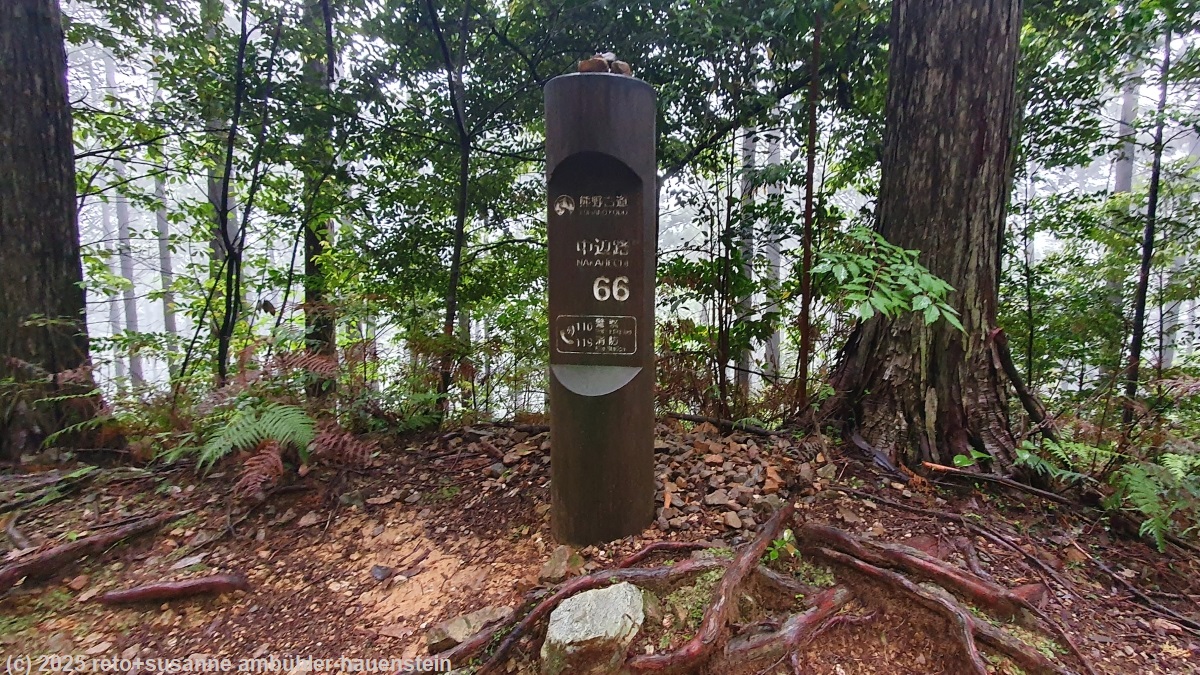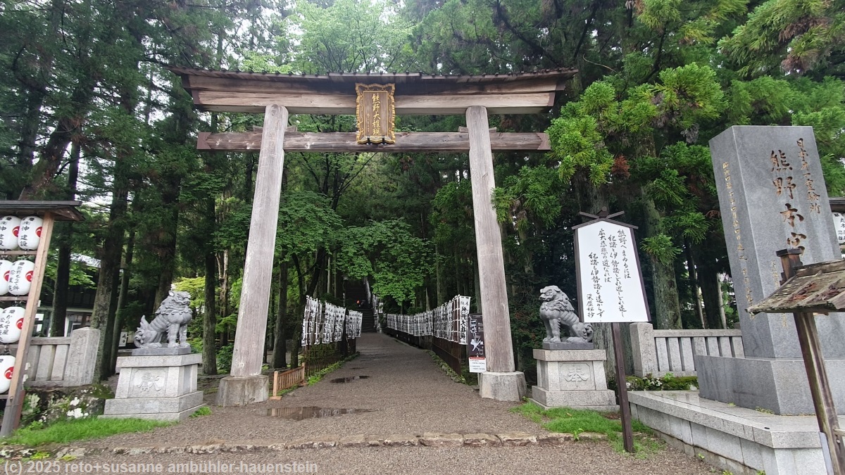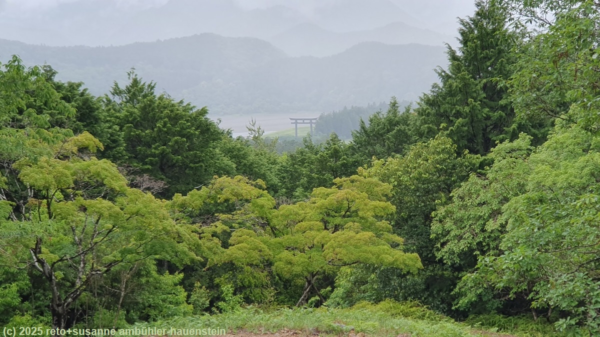 unser handy weckt uns um 7 uhr. das frühstücksbuffet ist ziemlich bescheiden und entspricht der beschreibung "light breakfast" ziemlich gut. so hat es kein müesli, aber immerhin croissants, margarine und konfitüre. gegen 8 uhr verlassen wir das hotel. als wir bei der bushaltestelle neben dem bahnhof eintreffen, warten schon erstaunlich viele leute auf den bus, der uns in die berge bringen soll. irgendwann bemerken wir, dass hier zwei busse unterschiedlicher linien kurz hintereinander abfahren. die grössere gruppe der wartenden steigt in den ersten bus, wir nehmen den zweiten, der deutlich weiter in die hügellandschaft fährt. gegen 08:40 uhr geht es los. beim einsteigen muss man einen kleinen zettel aus dem automaten neben der türe nehmen. auf diesem hat es eine nummer, diese bezeichnet die haltestelle, bei der man eingestiegen ist. auf einem bildschirm vorne im bus wird laufend angezeigt, welchen fahrpreis man für welche nummer bezahlen muss. logischerweise steigt der preis bei jeder haltestelle um einige yen. es steht im bus angeschrieben, dass man beim aussteigen dem fahrer das ticket und den genauen betrag übergeben muss. man könne aber vorher wechseln. das klingt irgendwie kompliziert. auf einem plakat steht aber auch, man könne den QR-code fotografieren und den fahrpreis mit einer app bezahlen. es gibt eine ganze liste von apps, die akzeptiert werden. ich versuche während der fahrt eine app nach der anderen zu installieren. die benutzerschnittstelle der ersten app ist nur japanisch, das ist wenig hilfreich. die zweite app installiert nicht richtig. die dritte scheint zu funktionieren. die texte werden sogar auf deutsch angezeigt und ich kann meine kreditkarte hinterlegen, aber als ich den fahrpreis bezahlen will, reklamiert die app stehts, dass sie meinen namen kennen müsse. da ich nicht herausfinde, wo ich meinen namen eintragen muss, gebe ich schliesslich auf und wir beschliessen, am ziel bar zu bezahlen. die fahrt führt über eine schmale und kurvenreiche strasse mitten in eine schöne hügellandschaft hinein. mit einigen minuten verspätung erreichen wir hongu taisha-mae. die meisten passagiere steigen hier aus. das bezahlen des fahrpreises entpuppt sich als kleines drama. es dauert ewig, bis wir endlich bezahlen und aussteigen dürfen. und von wegen "exact fare": der buschauffeur nimmt unsere JPY 4500 entgegen und gibt JPY 300 wechselgeld. manchmal scheint mir, es wäre einfacher, man würde nicht so viele regeln publizieren und einfach so handeln, wie es die situation erfordert. bis die letzten passagiere aus dem bus ausgestiegen sind, hätte der nächste bus längst fahren sollen. mit diesem fahren wir nach hosshinmon-oji, dem startpunkt unserer wanderung. das drama beim bezahlen der fahrkosten wiederholt sich in diesem bus, aber schliesslich sind alle ausgestiegen. als wir am morgen tanabe verliessen, schien sich die wolkendecke aufzulockern, wir sahen viel blauen himmel. nun aber hangen graue wolken tief in den hügeln und es fällt ein leichter nieselregen. wir ziehen die regenjacken über und machen uns auf den weg. wir wandern über ein stück des "kumano kodo" einem pilgerweg, auf dem man auch mehrtageswanderungen machen kann. anfangs geht es über eine asphaltierte strasse, dann ist der weg mit steinplatten belegt und schliesslich wird der pfad zu einem richtigen wanderweg. wir gehen durch einen üppigen wald. es ist sehr warm und extrem feucht, über dem wald liegen dampfwolken. es fühlt sich an, als würden wir durch einen tropischen regenwald marschieren. nach 3.4 km treffen wir auf fushiogami-oji, eine art kiosk mit tischen, die unter einem dach vor dem regen geschützt sind. es ist schon bald mittag. picknicken können wir hier nicht, aber wir erfrischen uns mit einem orangensaft. dazu kaufe ich einen sack mit gebäck. dieses schmeckt wie magenbrot, sehr köstlich. auf dem weiteren weg nimmt der regen zu. mir wird es in der regenjacke zu warm und so verstaue ich diese im rucksack und schütze mich stattdessen mit dem schirm vor dem regen. kurz nach der hälfte des weges hat es einen aussichtspunkt etwas abseits des pfades. wir machen den kleinen umweg. wegen dem trüben wetter ist die aussicht limitiert. immerhin sehen wir das grosse tor unten im tal. kurz vor 13:15 uhr sind wir wieder in hongu, da wo wir den bus gewechselt hatten.