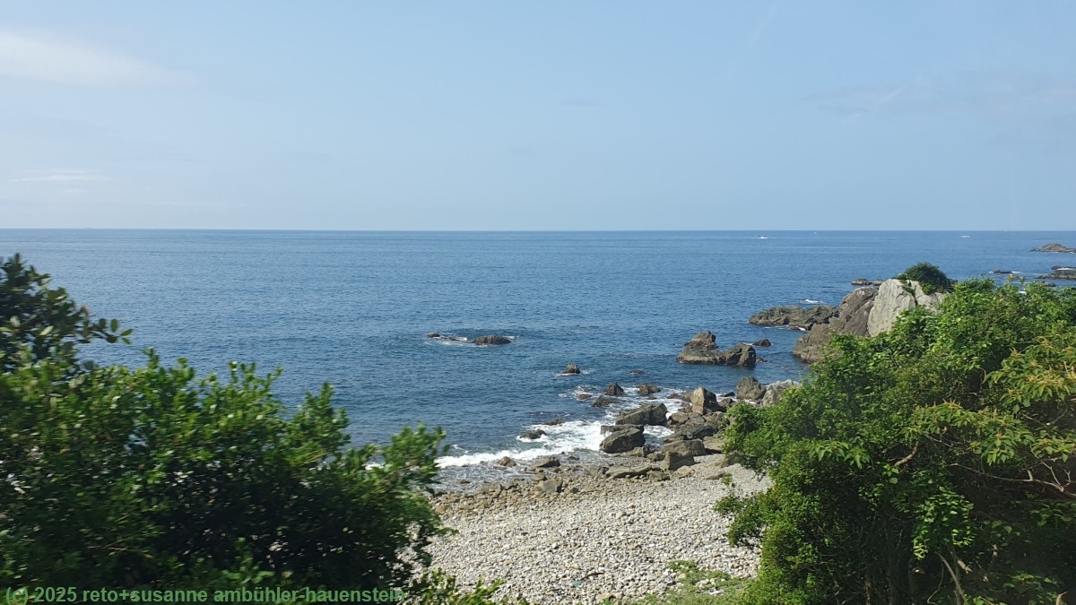 unser handy weckt uns um 06:20 uhr. die jungs haben es gerichtet und österreich mit 6:0 nach hause geschickt. was für ein lauf unserer eishockey-nationalmannschaft ! wir bedienen uns am bescheidenen frühstücksbuffet, danach machen wir uns auf den weg zum bahnhof. das wetter ist überraschend freundlich, der himmel ist wolkenlos. um 07:40 uhr sind wir auf dem bahnsteig, der zug ist bereits da. obwohl er aus nur zwei wagen besteht, hat es kaum fahrgäste. wir nehmen im hinteren wagen platz. der zug verlässt kii-tanabe pünktlich. wir fahren meistens durch täler und überqueren zahlreiche kleinere und grössere flüsse. zwischen den tälern durchbohren tunnels die vielen hügel. das fotografieren aus dem fahrenden zug ist äusserst schwierig, da wir immer nur ganz kurz einen freien blick auf die landschaft haben. das ist insbesondere während der fahrt entlang der schönen küste etwas schade.