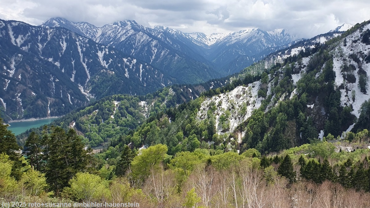 wenig später sind wir wieder bei der bushaltestelle murodo. elektrische busse bringen uns zusammen mit vielen anderen gästen durch einen tunnel nach daikanbo. diese elektrischen busse wurden erst dieses jahr in betrieb genommen, vorher verkehrten auf der gleichen strecke trolleybusse. bei daikanbo haben wir kurz zeit, von der aussichtsplattform aus einen ersten blick auf das ushiro-tateyama gebirge und den kurobe stausee zu werfen, danach fahren wir mit einer luftseilbahn nach kurobedaira hinunter. auf dem dach der talstation gibt es eine weitere aussichtsplattform. zu guter letzt fahren wir wieder mit einer standseilbahn durch einen tunnel zum kurobe damm hinunter. dieses mächtige bauwerk staut den gleichnamigen see. wir marschieren über den damm und geniessen auf einer bank auf der anderen talseite den rest unseres mittagessens.