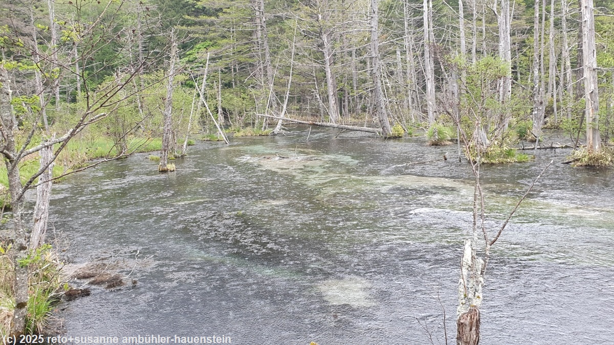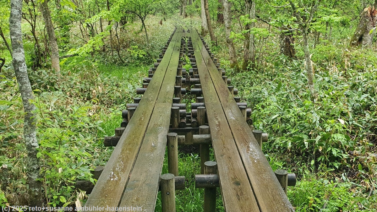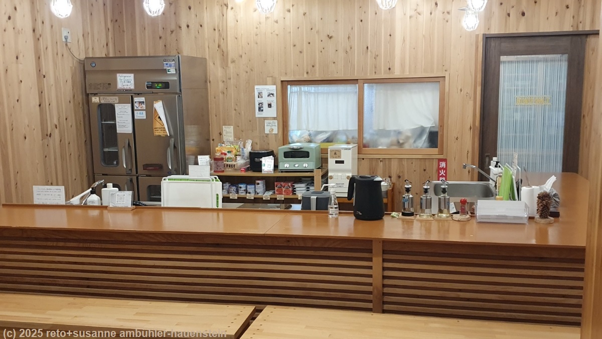 mitten im niemandsland liegt das raicho onsen inn. wir werden freundlich empfangen und dürfen das traditionelle zimmer mit dem namen "eiger" beziehen, was für eine lustige fügung. nachdem wir uns eingerichtet haben, kocht susanne in der gemeinschaftsküche unser abendessen. dieses schmeckt sehr lecker. danach reinigen wir uns im onsen. hier gibt es nur private onsen - zwei im haus, eines im freien - so dass wir das onsen zusammen besuchen dürfen.