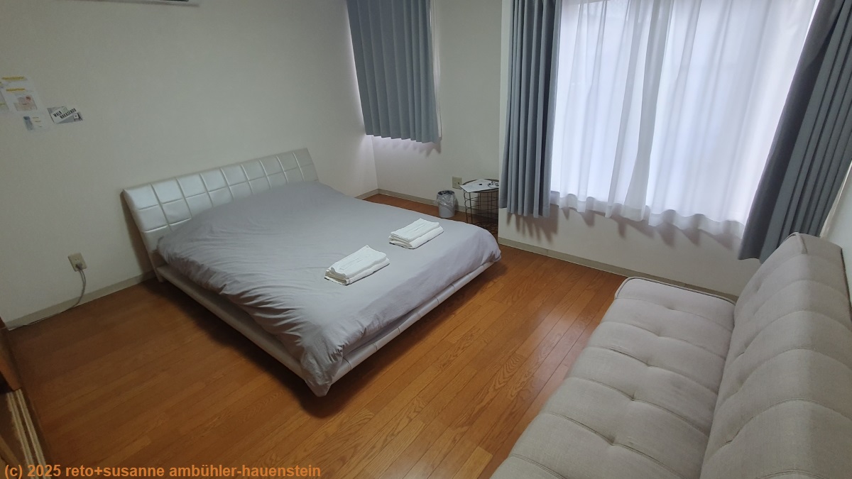 gegen 15:30 uhr erreichen wir unser tagesziel nakatsugawa. da unsere unterkunft keine parkplätze anbietet, parkieren wir unseren wagen beim einkaufszentrum valor ganz in der nähe. von da marschieren wir erst zur unterkunft. wir haben etwas mühe, diese zu finden, denn wir haben bloss einen namen in japanischer schrift. in der email mit der reservationsbestätigung gibt es zwar einen link zur wegbeschreibung, aber der eingang ist so unscheinbar, dass wir erst daran vorbeigehen. schliesslich haben wir das haus gefunden. an der tür steht, dies sei ein unbedientes gasthaus, die zugangcodes für den haupteingang und die zimmertüre würden einem per email zugestellt. tatsächlich finde ich im posteingang eine nachricht von dieser unterkunft mit den zahlenkombinationen. das zimmer ist schlicht aber schön und zweckdienlich.