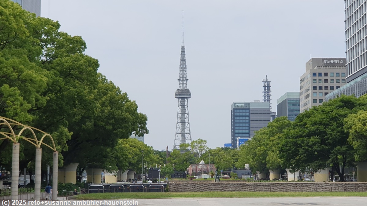 der hisaya odori park ist ein 2 km langer grünstreifen mitten in der stadt. am südlichen ende befindet sich der maezu park. im norden endet der park an der hisayabashi. im etwa 70 meter breiten park gibt es fusswege, kleine bistros, brunnen und wasserspiele. in seiner länge wird der park immer wieder durch quer verlaufende strassen unterbrochen. die hauptattraktion in diesem park ist der chubu electric power mirai tower, welcher auch als nagoya TV turm bezeichnet wird. die aussichtsplattform dieses turms ist unser nächstes ziel. schon von weitem sehen wir ihn in den himmel ragen.