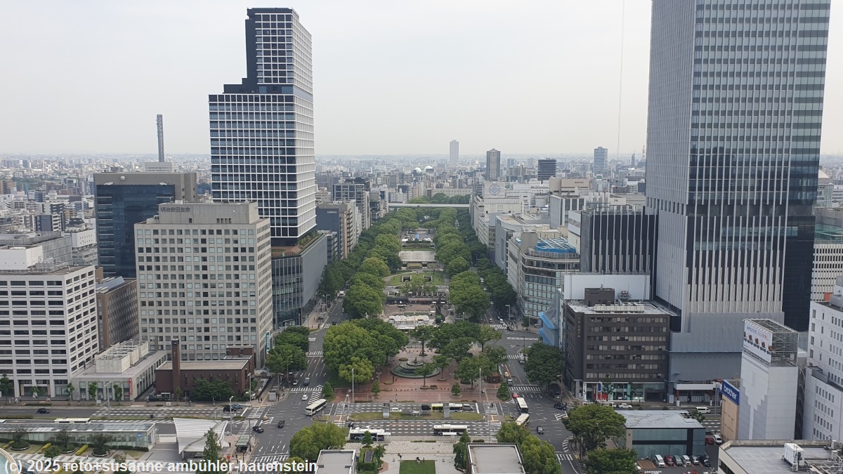 die nacht war relativ ruhig, aber ab 6 uhr wird es ziemlich laut. leute marschieren durchs haus und jemand trocknet sich unüberhörbar die haare mit einem föhn. als wir gegen 07:30 uhr aufstehen, sind wir erstaunlicherweise ganz alleine in der unterkunft. so können wir in der gemeinschaftsküche in ruhe frühstücken. danach packen wir unsere rucksäcke und marschieren zum parkplatz, auf dem unser wagen steht. die sonne scheint und es ist ziemlich warm. wir machen unser auto startklar, danach bezahlen wir die parkgebühr, welche uns mit JPY 1200 (ca. CHF 8) für zwei tage sehr günstig scheint. die anfahrt zur autobahn wird wie üblich durch dichten verkehr und unzählige ampeln verzögert. das ändert sich schlagartig, als wir auf die autobahn einfahren. es hat nur wenig verkehr, darunter bemerkenswert viele lastwagen. diese sind jedoch deutlich kleiner als was wir uns von zuhause und vorallem von deutschland gewohnt sind. die zügige fahrt wird durch einige baustellen mit einspuriger verkehrsführung nur geringfügig gebremst. das wetter bleibt freundlich, auch wenn nun mehr wolken aufziehen. als wir uns nagoya nähern, nimmt der verkehr zu. da wir eine erste ausfahrt verpassen, machen wir einen kleinen umweg. trotzdem erreichen wir das stadtzentrum gegen 10:30 uhr. am bahnhof vorbei nähern wir uns dem nissan autoverleih. doch bevor wir den wagen abgeben können, müssen wir ihn noch volltanken. danach schaffen wir auch noch den letzten kilometer unbeschadet. die abgabe des wagens verläuft unkompliziert. während das auto bei der übernahme sehr gründlich angeschaut und jeder kleinste kratzer vermerkt wird, interessiert bei der abgabe bloss, ob der tank voll ist. wir sind mit dem kleinwagen sehr zufrieden. für 806 km haben wir 36.8 l benzin verbraucht, das sind 4.6 l pro 100 km. dafür haben wir umgerechnet CHF 39 bezahlt. wir marschieren mit unserem gepäck zum nahen hotel, welches wir schon von unserem besuch vor zehn tagen kennen, und deponieren unsere rucksäcke. auch wenn eine dünne wolkenschicht den himmel bedeckt, so ist es mit 27°C sehr warm. wir gehen als erstes zum bahnhof und trinken etwas, ich esse dazu eine kleinigkeit. danach beziehen wir an einem automaten unsere fahrkarten für die morgige zugsfahrt von hier via tokyo nach hakodate. das klappt zu unserer beruhigung hervoragend. nun haben wir noch einen guten halben tag zeit, nagoya zu erkunden. als erstes fahren wir mit dem aufzug in den 15. stock des JR towers. von hier haben wir einen schönen ausblick auf die stadt.