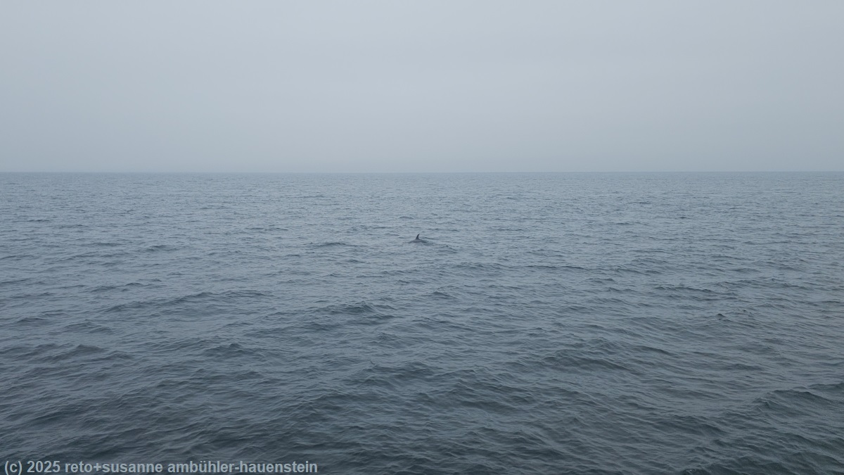 unser handy weckt uns um 06:45 uhr. der himmel ist verhangen, die wolkenschicht liegt so tief, dass wir den nahen turm nicht sehen können. wir fragen uns, ob die whale watching tour bei diesem wetter wohl durchgeführt wird ? da wir keine email mit einer absage erhalten haben, stehen wir auf und frühstücken. um 08:15 uhr machen wir uns auf den weg zum büro der whale watching firma gojiraiwa kanko in rausu. als wir dort ankommen, stehen schon mehrere autos vor dem geschäft. wir bezahlen für die tour und fahren dann mit unserem camper zum nahen hafen. dort werden wir bereits erwartet. beim einsteigen wird uns eine schwimmweste ausgehändigt, dann nehmen wir im kleinen oberdeck platz. die vier bänke sind rasch voll. das boot verlässt den hafen zusammen mit schiffen anderer firmen. unser kapitän steuert erst etwa 6 km geradewegs ins offene meer hinaus, dann folgt er der küste nordwärts. die insel kunashiri ist keine 20 km entfernt. sie gehört eigentlich zu japan, wurde aber von russland besetzt. je länger wir unterwegs sind, umso dichter wird der nebel. ausser zwei albatrossen und hunderten von möven gibt es nichts zu sehen. schliesslich wendet der kapitän das boot und fährt wieder südwärts. zumindest die sicht wird besser, selten sehen wir die sonne durch die wolkenschicht. mehr als die hälfte der tour ist bereits vorbei, als zum ersten mal leben in die passagiere kommt. jemand hat zwei oder drei delfine entdeckt. der kapitän verfolgt die tiere für mein empfinden etwas gar aggressiv, manchmal tauchen die delfine knapp neben dem boot auf. wir können sie eine weile beobachten, fotografieren ist mit dem handy kaum möglich. auch mit einer richtigen kamera muss man enorm schnell reagieren, denn die tiere sind immer nur für einen kurzen augenblick zu sehen. schliesslich setzen wir unsere fahrt fort. die meisten passagiere auf dem oberdeck und auch zwei besatzungsmitglieder suchen weiterhin krampfhaft die wasseroberfläche ab. da taucht plötzlich ein kleiner zwergwal auf. dieses mal hält der bootsführer mehr abstand. irgendwann entdecke ich den wal auf der anderen bootsseite. ich versuche erst gar nicht, fotos zu machen, aber susanne gelingen einige schnappschüsse, auf denen der wal deutlich zu sehen ist. ein zweites boot gesellt sich zu uns. wir halten weiterhin angestrengt ausschau und sehen den wal noch zwei drei mal auftauchen, dann ist er verschwunden. es ist zeit, die rückfahrt anzutreten. auf dem weg zum hafen sehen wir noch eine ganze schule delfine, aber die besatzung nimmt keine notiz mehr. um 11:30 uhr sind wir wieder an land.