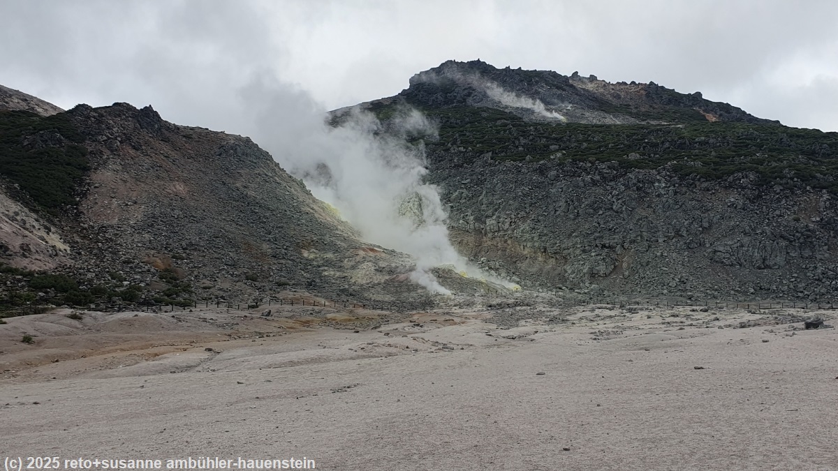 wir stehen um 07:30 uhr auf. während wir im camper frühstücken, rüttelt ein böiger wind an unserem wagen und es regnet heftig. als wir um 9 uhr aufbrechen, hat wenigstens der regen nachgelassen. wir folgen der küstenstrasse südwärts bis shibetsu. hier wechseln wir auf die strasse 272 und fahren ins landesinnere. bei nakashibetsu kaufen wir für die nächsten tage ein. um mittag sind wir am lake kussharo. wir klappern verschiedene campingplätze ab, aber der eine existiert gar nicht mehr, ein anderer ist dieses jahr wegen renovationsarbeiten geschlossen und die restlichen zwei plätze haben zumindest heute zu. in der road side station teshikaga erfahren wir vom mashu forest park und dieser platz hat tatsächlich offen. nachdem wir nun eine bleibe für die nacht gefunden haben, fahren wir zum mount io rest house im akan-mashu nationalpark, machen einen kurzen spaziergang über den tsutsujigahara nature trail und besuchen die heissen quellen. kurz nach 17 uhr fahren wir nach kawayu onsen und reinigen uns im onsen des kawayu kanko hotel. gegen 18:15 uhr sind wir wieder auf dem campingplatz und geniessen das nachtessen. anschliessend planen wir den morgigen tag und die rückfahrt nach sapporo. gegen 23:30 uhr schlüpfen wir in unsere schlafsäcke.