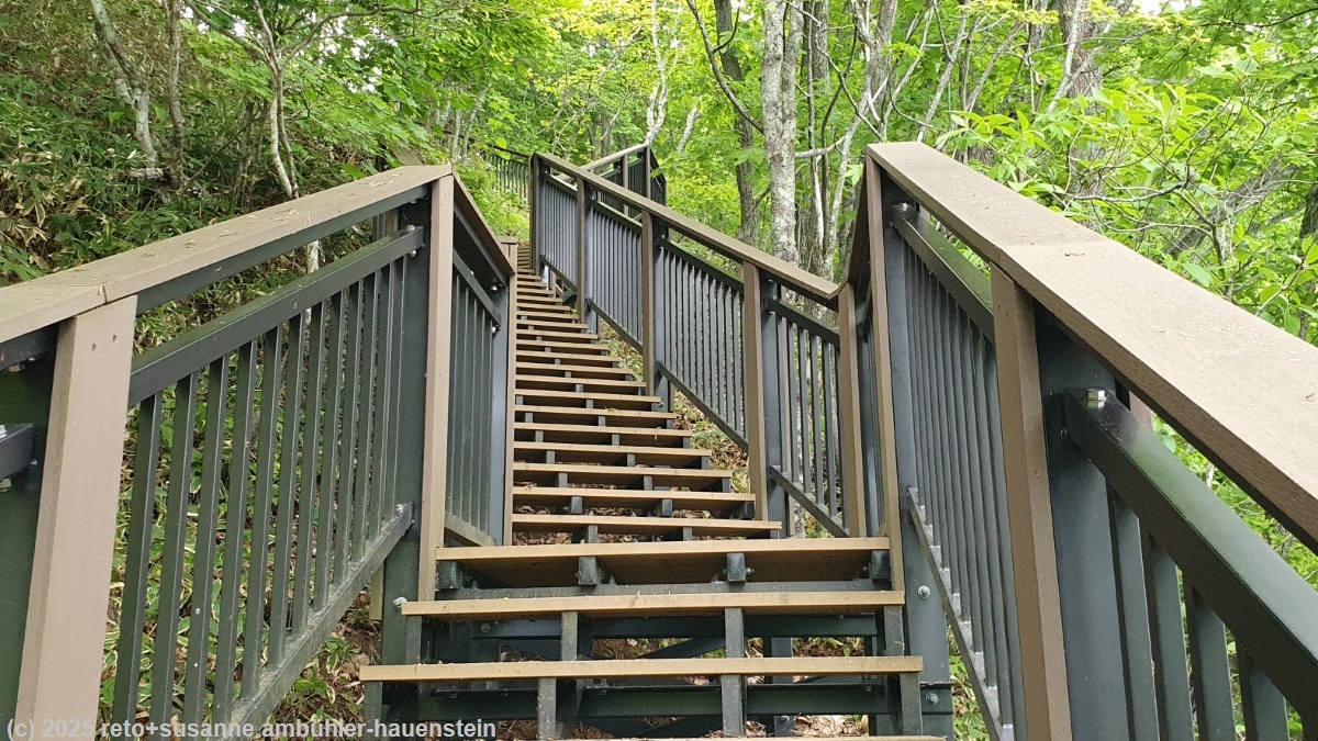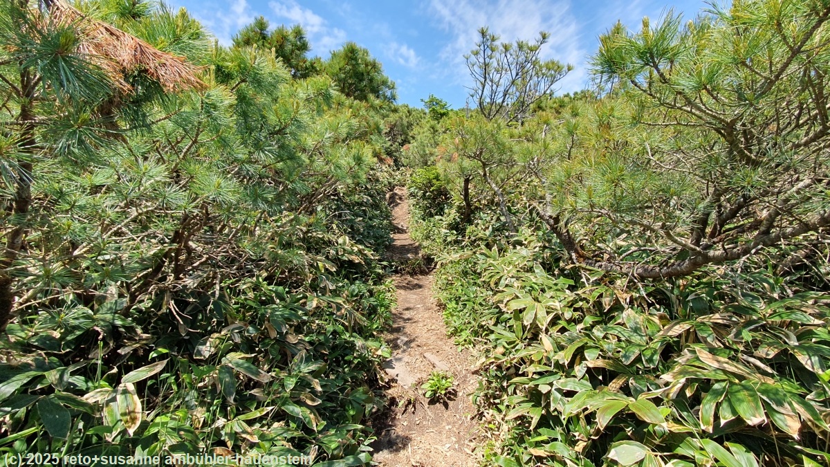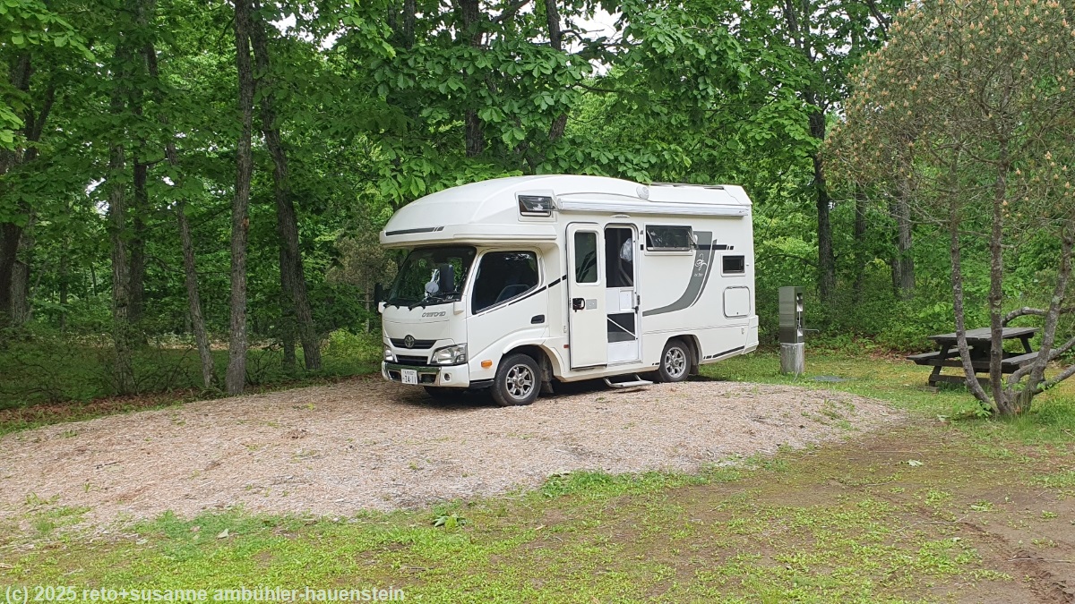 gemäss wetterbericht ist es 20°C, aber es fühlt sich eher wie mindestens 25°C an. nach dem essen nehmen wir die zweite hälfte der rundwanderung in angriff. wieder geht es über einen schmalen pfad steil bergauf. bezüglich fernsicht kann der zweite abschnitt nicht mit dem ersten mithalten, aber wir marschieren wiederum durch einen sehr schönen wald. am ende des sakhalin fir trail entscheiden wir uns, dem weg richtung campingplatz zu folgen. wir sind neugierig, was dieser zu bieten hat. der highland koshimizu campground ist zur zeit noch geschlossen. der platz sieht aber toll aus. es hat grosse gebäude, in denen man vielleicht übernachten kann, aber auch sehr schöne parzellen für zelte und wohl auch für camper.