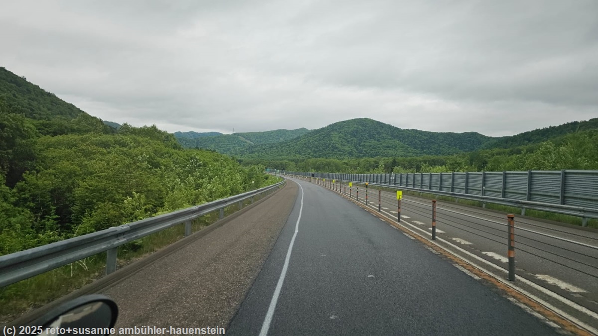 wie geplant brechen wir kurz nach 8 uhr auf. bei regen und wind fahren wir westwärts durch eine - vermutlich - wunderschöne berglandschaft, denn es ist kaum etwas zu sehen. tiefe wolken und nebelschwaden behindern die sicht. die kurvenreiche strasse haben wir weitgehend für uns alleine. kurz vor dem lake akan folgen wir nun entgegen unserem plan nicht weiter der strasse 241, sondern biegen südwärts ab auf die strasse 240. am wetter ändert sich wenig, es regnet in unterschiedlicher intensität. manchmal scheint es zwar, als würde jeden augenblick die sonne scheinen, aber das geschieht nicht. in kushiro kaufen wir einige lebensmittel, wenig später fahren wir auf die E38 ein. dies ist allerdings keine vierspurige autobahn, sondern eine zweispurige autostrasse. selten hat es in die eine oder andere richtung kurze doppelspurige abschnitte. es hat zwar ganz ordentlich verkehr, aber die meisten fahrzeuge sind mit dem für japan üblichen tempo unterwegs, also 20 bis 30 km/h über der angegebenen geschwindigkeit. zu gerne würde ich verstehen, wie das gemeint ist mit der tempolimite.