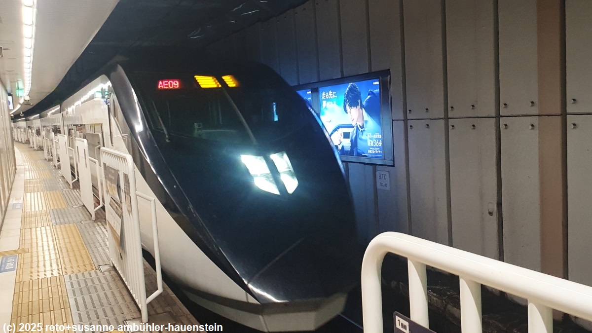 wir haben sehr gut geschlafen. ich habe gar nichts vom baulärm gehört, susanne meint, sie hätte wohl einmal ein rammen oder stampfen bemerkt. wir stehen um 06:30 uhr auf. als wir eine halbe stunde später zum frühstück ins restaurant marschieren, ist die baustelle verschwunden - unglaublich ! in einer nacht wurde die arbeit erledigt und die kreuzung neu asphaltiert. nach dem frühstück schultern wir unsere rucksäcke und marschieren zur metrostation hatchobori. mit der hibiya line fahren wir zur ueno station. wir haben noch fast 45 minuten zeit, bis der narita express fährt. auf unseren SWICA karten sind noch ein paar hundert yen geladen, die würden wir uns gerne auszahlen lassen. in der metrostation geht das nicht, aber im nahen ueno bahnhof müsste es möglich sein. auf dem kurzen weg dorthin ist es schon sehr warm. aus der auszahlung wird aber nichts und so kehren wir zur metrostation zurück. der narita express fährt schon bald ein, wird aber noch gereinigt, bevor wir einsteigen dürfen.