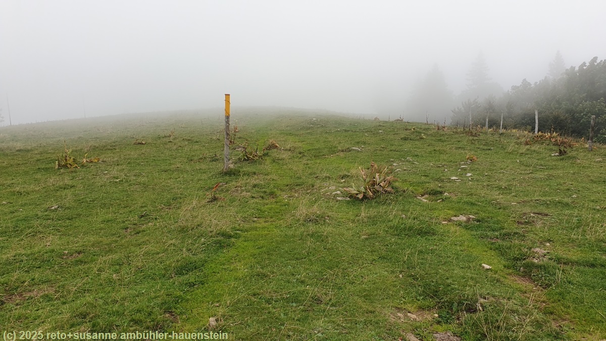 nach dem kahlen gipfel folgt ein steiler und wegen der nassen steine etwas rutschiger abstieg. kaum haben wir den tiefsten punkt erreicht, geht es genau so steil wieder aufwärts. kurz unter dem höchsten punkt machen wir einen kurzen halt, essen einen stengel und trinken etwas. es folgt ein eher flacher abschnitt über offene wiesen. der nebel ist so dicht, dass man keine 30 meter weit sieht. trotzdem sehen wir gelegentlich bis ins tal hinunter. wir erkennen grenchen und die piste des flugplatzes. der pfad verläuft auf gleichbleibender höhe durch viehweiden. in der nähe von oberberg gelangen wir auf eine asphaltierte strasse. das ist zwar unsere am wenigsten geschätzte unterlage, hat aber den vorteil, dass man mit wenig energieaufwand relativ rasch voran kommt. dies gilt ganz besonders, wenn die strasse leicht abwärts führt. in einer waldschneise hat es einen skilift, der aussieht, als ob er noch in gebrauch ist. wenig später wandern wir an einem zweiten skilift vorbei. beim restaurant untergrenchenberg picknicken wir auf einer bank vor der sternwarte auf der anderen strassenseite. während wir essen, bläst ein kühler wind und es fallen einige regentropfen. das restaurant hat - wie alle gasthöfe an unserer heutigen route - ruhetag. so müssen wir ohne kaffee auskommen.