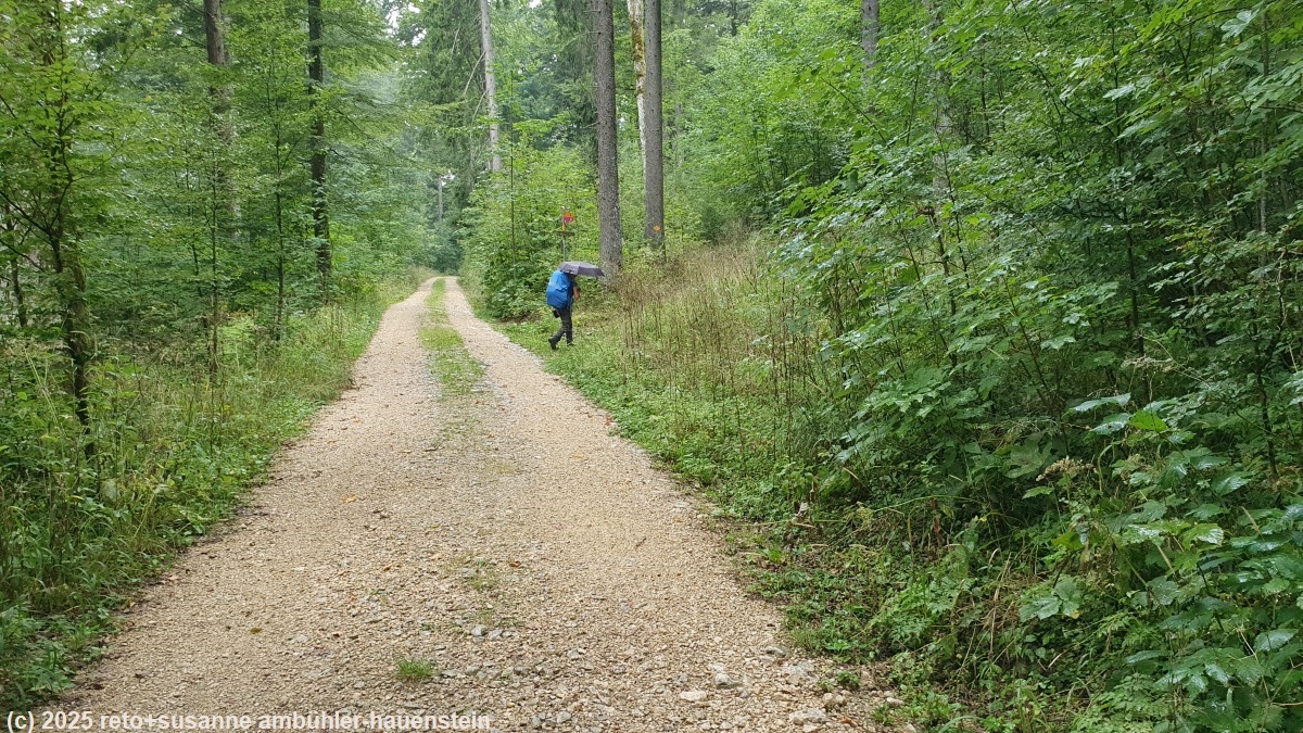 | unterwegs mit regenschirm auf waldweg bei stützli | jura-höhenweg zwischen stierenberg und sur le châble |
