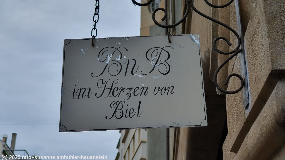 die fahrt mit dem bus dauert eine gute halbe stunde. wir steigen bei der haltestelle bei der altstadt aus und sind schon fast am ziel. allerdings können wir unser zimmer erst ab 17:30 uhr beziehen, das heisst, wir sind noch eine gute halbe stunde zu früh. wir marschieren deshalb zum nahen migros und erledigen den einkauf. auf dem rückweg kaufen wir in einer apotheke wundsalbe für meine füsse. beim "B&B im herzen von biel" werden wir sehr freundlich empfangen. das gebäude scheint früher ein spital oder pflegeheim gewesen zu sein. wir sehen schalter und einrichtungen, wie man sie aus spitälern kennt. die zimmer sind jedoch sehr schön eingerichtet. zudem gibt es eine gemeinschaftsküche, dort dürfen wir morgen frühstücken.