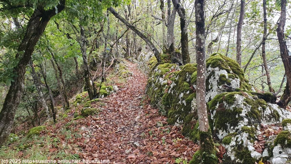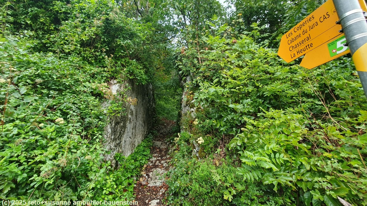 unser handy weckt uns um 06:15 uhr. in der nacht hat es geregnet und der wind hat im innenhof geheult wie ein räudiger hund. wir frühstücken in der gemeinschaftsküche. kurz vor acht uhr verlassen wir die unterkunft und marschieren richtung bahnhof. unterwegs stocken wir unseren vorrat an blasenschutzpflaster auf. die zugfahrt nach frinvillier-taubenloch dauert nur gerade sechs minuten. die ersten 700 m sind lockeres einlaufen entlang der strasse, dann geht es durch einen spalt im felsen zum langen und steilen aufstieg richtung les coperies. auf knapp 4 km steigt der pfad um 600 meter. der weg ist manchmal etwas steinig und rutschig, im allgemeinen aber gut zu begehen. eine stelle ist etwas ausgesetzt, dort hat es ketten um sich festzuhalten. wir wandern durch einen schönen wald, aber unter uns hat es viel industrie und von irgendwo hört man lästigen baulärm. der schweizer jura ist in bezug auf lärmbelästigung nicht mit nordskandinavien zu vergleichen. dort können wir tagelang in absoluter ruhe wandern, in der schweiz gibt es immer strassen-, flug-, schiess- und/oder industrielärm. je höher wir kommen desto weniger laut ist es. nachdem wir die ersten 600 höhenmeter überwunden haben, marschieren wir durch ausgedehnte weiden. auf manchen hat es viele kühe. meistens sind diese sehr entspannt, aber auf einer weide beginnen die tiere von uns weg zu rennen. sie versammeln sich unglücklicherweise immer wieder auf dem weg. wir versuchen sie zu umgehen, aber sie laufen trotzdem weg. selbst als der weg dem waldrand entlang geht, hat es vieh. susanne ist es gar nicht wohl, aber die tiere sind nicht agressiv und wenn ich mit ihnen spreche, dann trotten sie irgendwann davon. auf einem baumstrunk machen wir kurz rast. der weg ist nun ein auf und ab. die landschaft scheint uns für den jura sehr typisch. es tauchen auch die ersten trockensteinmauern auf.