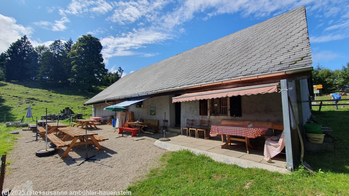 bei der cabane du jura machen wir mittagsrast. gerade als wir uns auf eine bank im garten setzen, setzt leichter regen ein. wir dislozieren deshalb auf eine bank unter dem vordach, da hat es sogar einen tisch. kaum haben wir uns wieder gesetzt, scheint die sonne. während wir unsere brote verzehren, ändert das wetter immer wieder, die sonne scheint nun aber öfters.
