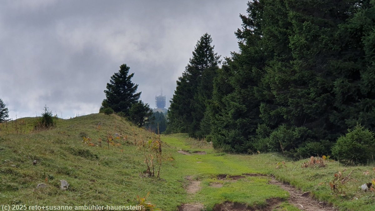 während wir uns dem markanten sendemast auf dem chasseral entgegen kämpfen, wird dieser plötzlich von wolken umhüllt. als wir dann aber endlich oben sind, haben wir eine fantastische rundsicht. wir erkennen die drei seen bielersee, murtensee und neuenburgersee. der chasseral ist mit 1606 m.ü.m der höchste punkt des berner jura, aber nicht die höchste erhebung der gesamten jurakette. der höchste punkt des jura-gebirges ist der mont tender im kanton watt. dieser ist 1679 meter hoch, 73 meter höher als der chasseral. richtung südwesten sehen wir unsere unterkunft auf einer alp knapp 170 meter unterhalb des gipfels.