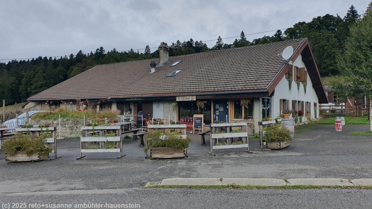 als der wanderweg endlich von der strasse abbiegt, setzen wir uns auf eine steinmauer in einer weide und essen zu mittag. die restliche strecke bis zum restaurant la combaz ist etwas weniger spektakulär. es geht auf und ab, über weiden und durch wälder, aber mit wenig aussicht. zudem ziehen immer mehr wolken auf. um 15 uhr erreichen wir das tagesziel unserer wanderung, la combaz.