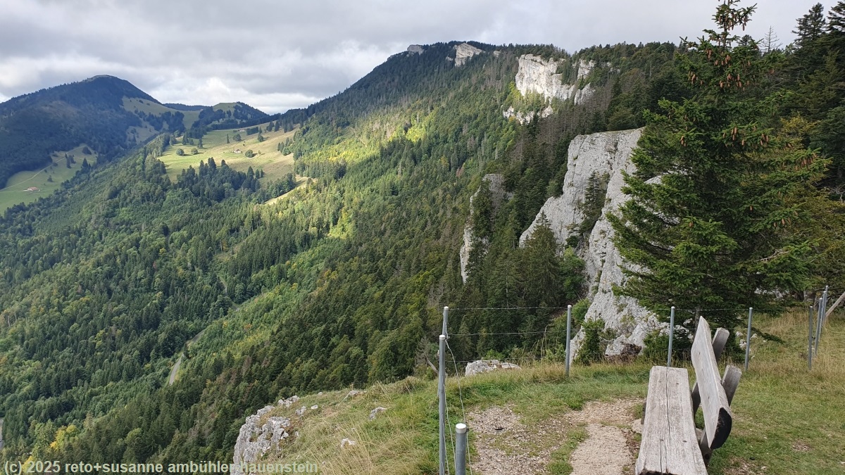 auch auf der krete steigt der weg weiter an. erst auf dem 1515 meter hohen aiguilles de baumles haben wir den ersten gipfel erreicht. dies ist allerdings noch nicht der höchste punkt unserer heutigen wanderung. auf einer bank mit fantastischer aussicht richtung osten machen wir kurz rast und schiessen einige bilder.