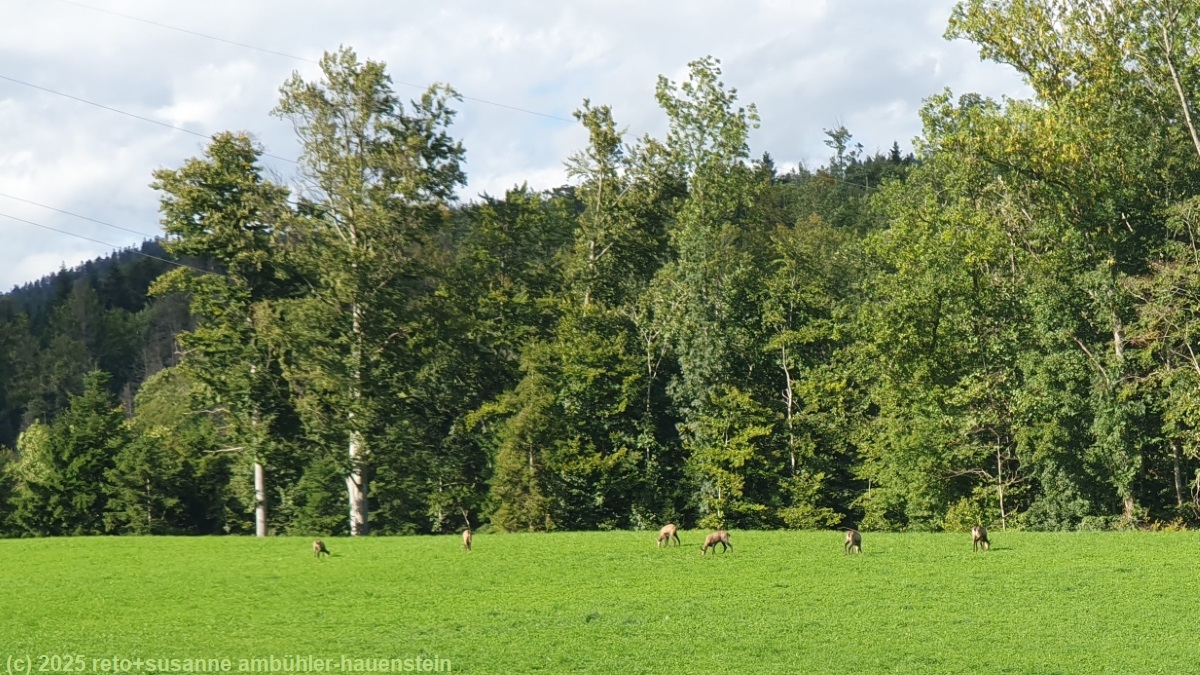 frisch gestärkt nehmen wir den langen abstieg in angriff. dieser ist leicht zu bewältigen. trotzdem schaffen wir es heute zum zweiten mal, eine abzweigung zu verpassen - wir marschieren richtung la sagne statt richtung la poyette - und wieder müssen wir 200 meter zurück gehen. um 15:45 uhr erreichen wir ballaigues. das einzige restaurant hat natürlich geschlossen, denn heute ist ja montag. so müssen wir unsere wanderung ohne kaffeepause fortsetzen. wir überqueren die autostrasse, dann geht es in einem weiten bogen zur staumauer des lac de day hinunter. auf der anderen seite des sees erwartet uns ein kurzer aber anstrengender aufstieg. beim bahnhof macht der wanderweg einmal mehr eine schleife und folgt den gleisen bis zur orbe. auf einer wiese am ortsrand sehen wir ein rudel gämsen. sie lassen sich weder von uns noch von den beiden radfahrern irritieren und grasen friedlich. da wo der wanderweg das flussufer erreicht, überspannt eine schöne bogenbrücke die orbe. hoch über dem wasser fährt der zug über die brücke, darunter führt ein fussweg durch die brückenpfeiler auf die andere flussseite. die durchgänge durch die pfeiler ergeben ein fantastisches fotosujet. dem fluss entlang marschieren wir in den ort.