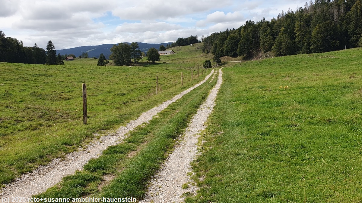 daher freuen wir uns auf einen kaffee auf der windgeschützten terrasse des restaurant le dent de vaulion. dazu gibt es ein stück köstlichen heidelbeerkuchen. nun sind es weniger als 6 km bis zum tagesziel. der abstieg bis pétra félix ist etwas holprig aber gut zu bewältigen. bei der landstrasse 130 wendet der weg. bis hierher werden wir morgen den selben weg in entgegen gesetzter richtung gehen müssen. auf einem feldweg geht es mit leichtem gefäll durch weideland.