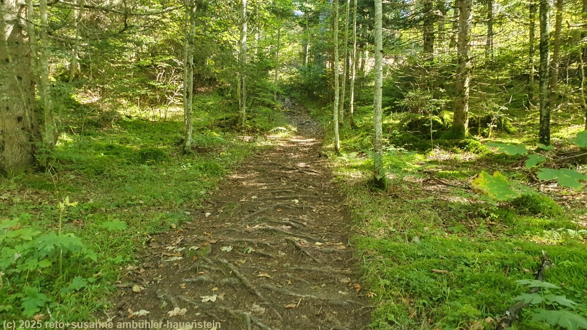 40 minuten später brechen wir wieder auf. es folgt nun ein längerer abstieg. der pfad verläuft vorwiegend in angenehm schattenspendenem wald, gelegentlich wandern wir aber auch über offenes weideland. die temperatur übersteigt die 20°C marke deutlich, wärmer braucht es von uns aus nicht zu werden. bei den ruines du couvent d'oujon erreichen wir den tiefsten punkt. der weg steigt noch einmal fast 90 höhenmeter an, bevor wir definitiv zu unserem tagesziel hinunter marschieren.